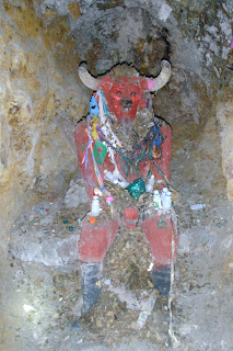 The miners believe that God can't help them in the mines and therefore they worship El Tio. There is at least one Tio in each mine and hundered of independent mines tunnel through the mountain. Mines often stretch for around 14km and can have as many as 16 levels. The mines often intersect each other if they are following the same mineral vein. Miners feel obligated to make generous offering to El Tio to keep them safe while they are in the mines. You can see coca leaves, cigarettes, and full alcohol bottles scattered around El Tio. Worshiping El Tio is believed to aid fertility.