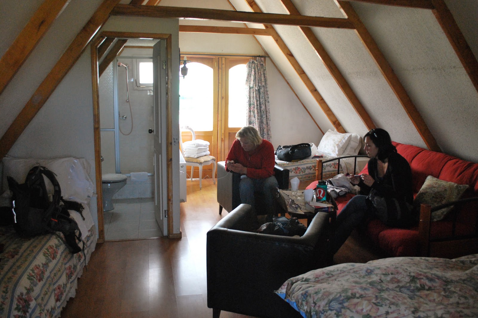 The weather was sunny and brisk, and we left our bags at the terminal as we rushed around town trying to find a hostel (along with the other 200 people on the boat, minus those who were smart enough to make advance reservations.) We tried a number of places that were either full, or too expensive, but eventually we (the two of us and Will) got lucky and found a triple room at Hostel Los Castillos (paying the same (or less) than the average price of a dorm bed in town), and it turned out to be one of the best hostels we've stayed in thus far. We had the entire upstairs loft to ourselves, complete with sunny enclosed patio, private bathroom, and room to comfortably sleep 6 if we really wanted (we didn't). The cheerful hostess served us a wonderful breakfast too, complete with eggs!