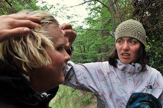 Only one minor injury was sustained. The cover story involved a puma encounter, but in reality, Will had a run in (literally) with a low-hanging tree branch. Luckily the 1st-aid kit made the day-pack and we fixed him all up and continued along our way. Here's a funny candid of the situation. Note: Alex really wasn't as unimpressed as she appears.