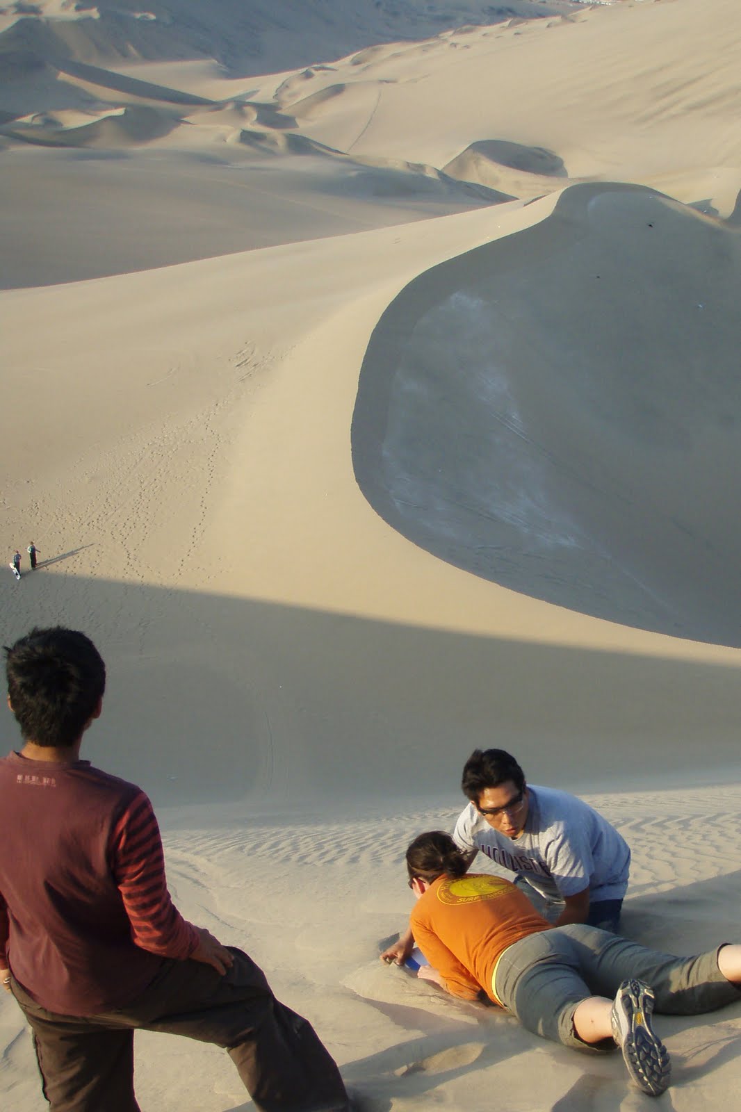 We tried sandboarding "snowboard-style" but discovered that going down on your stomach, head first, was way more fun, because you could get going way faster. We played around in the dunes until sunset then headed back to Huacachina.