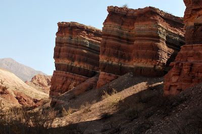 That afternoon we went on a tour of the nearby 80km-long canyon Quebrada de Cafayate (a.k.a. Quebrada de las Conchas) in the Calchaquí Valley. We visited famous formations such as El Obelisco, Los Castillos (the castles), La Garganta del Diablo (the throat of the devil), El Anfiteatro (the ampitheater), el Sapo (the frog), and the mountain of 17 colors. We saw 48 kilometers of the spectacular sceenery, stopped along the way to hike around in the landscape. We took lots of pictures!