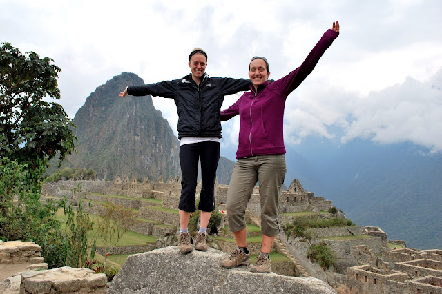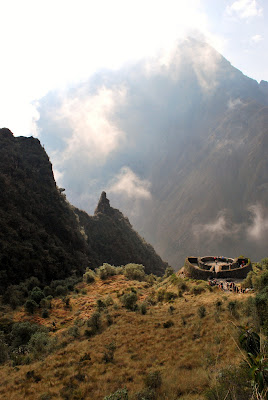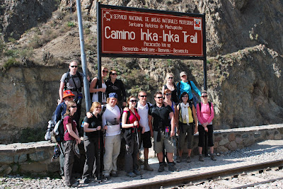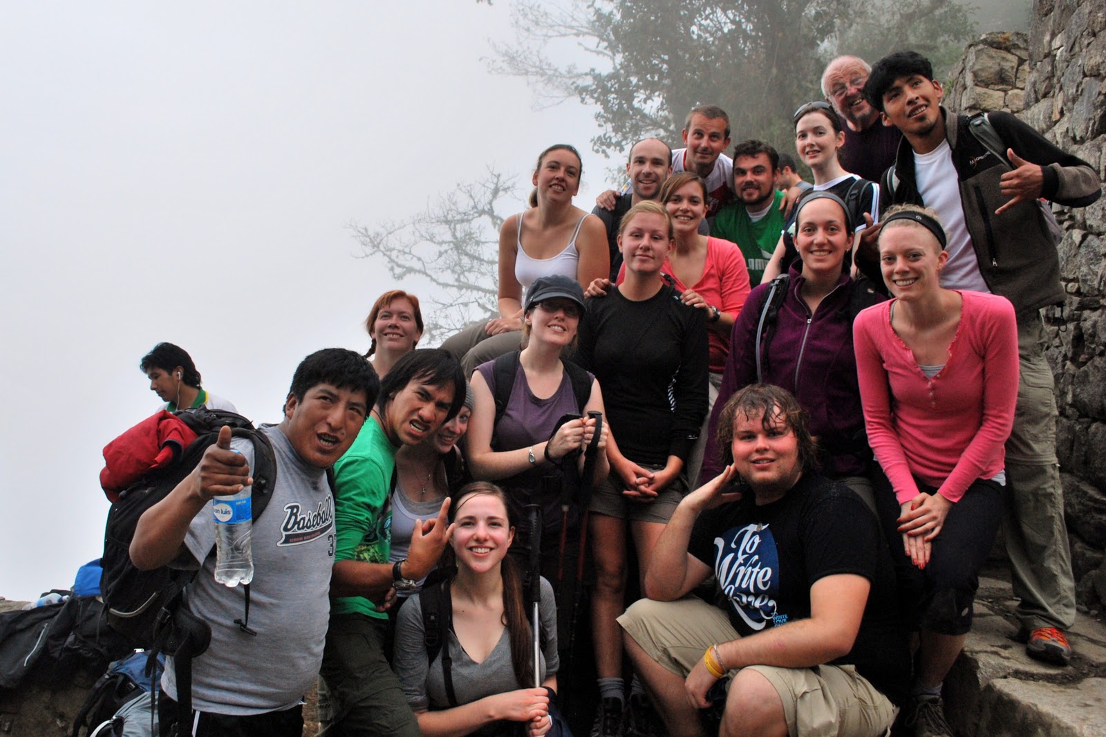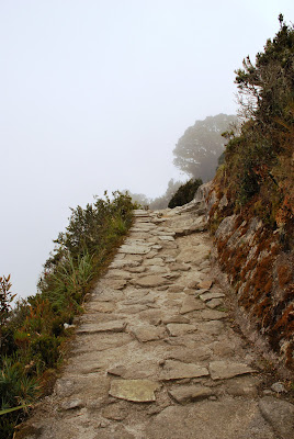 We crawled into bed at the ridiculous hour of 7:00pm to try and catch a good sleep before the 3:00am wake-up call the next morning. It began pouring rain at about 2:45am and our first thoughts were that it was going to be a cold, wet, dark morning. Fortunately it stopped raining just before breakfast, and we the trail at 4:00am. The objective was to be the first group to the "checkpoint" and hence the first group to reach the Sungate (where we would be able see Machu Picchu at sunrise). We were indeed the first group at the checkpoint, but that meant we had an hour and a half to kill while we waited for the trail to open. The final stretch included a ridiculously steep set of stairs. Despite the fatigue, we all "gave 'er" and raced for the sungate. Here it is!! Note: completely cloudy. We couldn't see Machu Picchu. Got a great group shot though! We were really expecting to see sunrise over Machu Picchu but we should have taken the hints from our guide more seriously, who referred to the Sungate as the "Cloudgate" the whole 4 days.