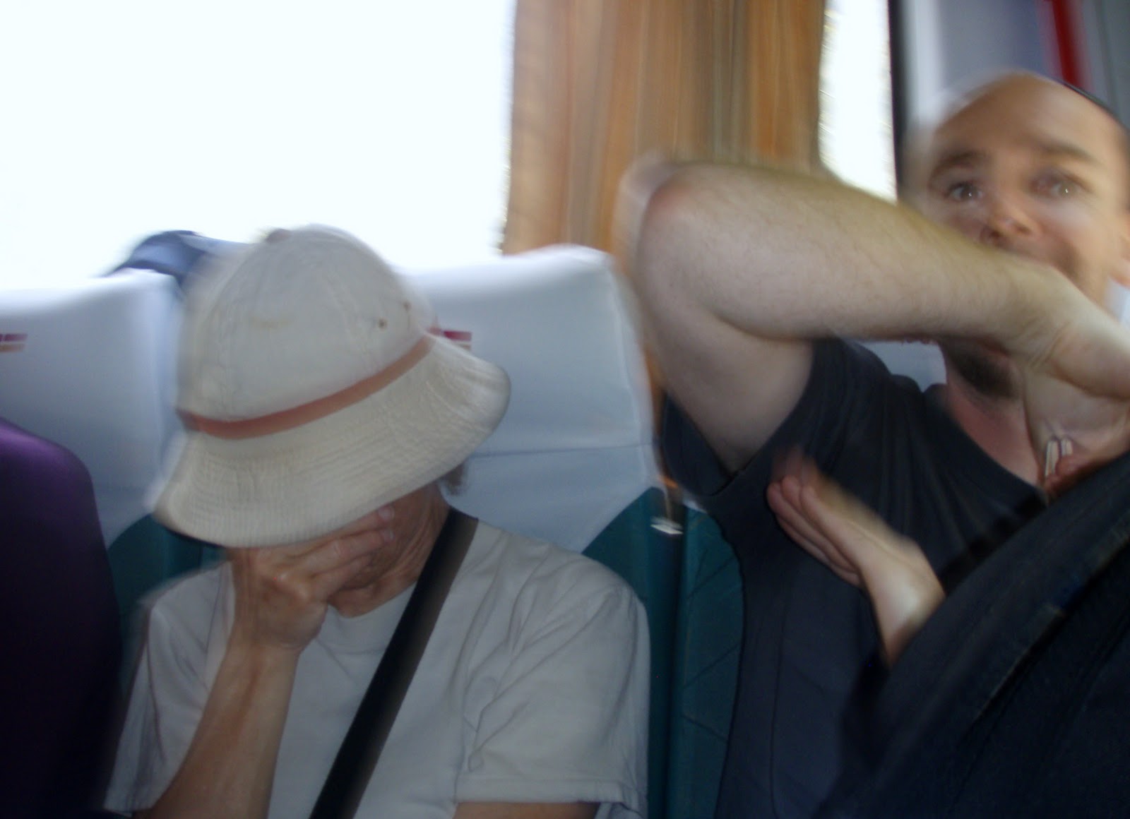 This is the token halarious picture of the post. We weren't on the bus when this happened; but, apparently this lady sat down on the very last seat on the bus between Les (from New Zealand) and Mark (ex-pat Australian who just spent 3 years in Toronto) (two fellow Inca trail hikers) and this was her look for the entire 30 minute ride down. She was pretending to sleep I guess, but was really covering her nose from the undeniable scent of two men who have just spent four days hiking. Mark is kindly wafting the scent her way! Photo credit: Matt Leek.