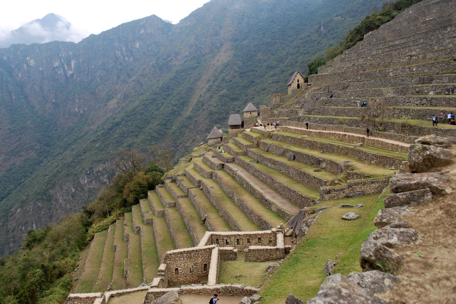 The terraces below were used for agriculture, whereas some of the terraces on the other side of the site were mainly for structural support and decoration. Because of the steep grade of the mountain, the terraces made agriculture possible; without them, rain would simply wash down the slope, and mudslides would have been inevitable.