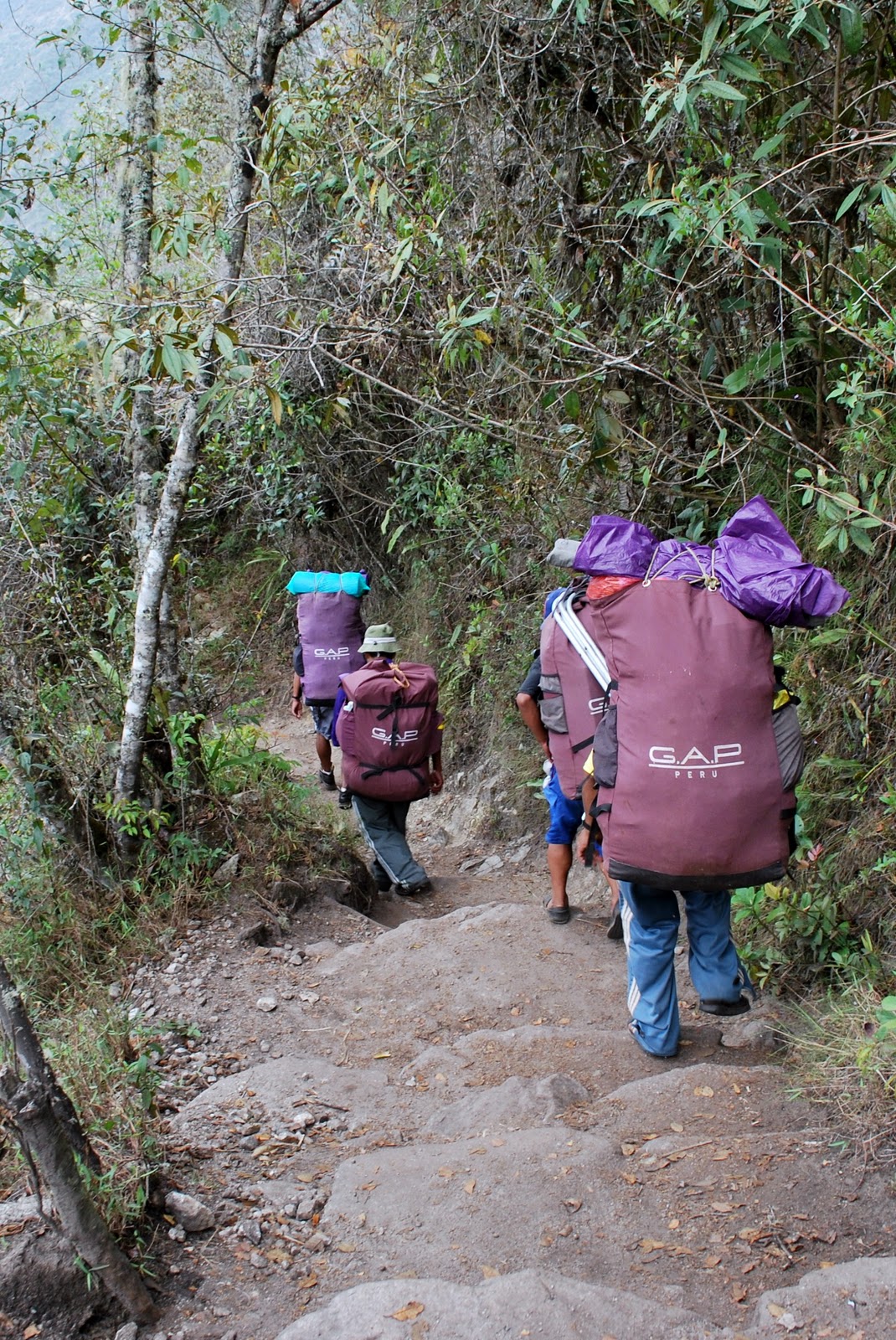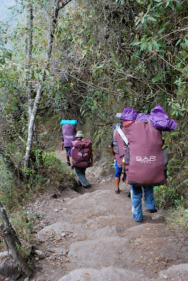 After lunch on the third day of hiking, there was a mad race for the final campsite, where we would be able to shower for the first time in 3 days. The final 6km descent to the campsite was a long, steep, downhill staircase, nick-named the "gringo-killer". We learnt that "gringo" isn't actually a derogatory term here (unlike in some places). Lisa was on a bit of an adrenaline kick and raced down behind the porters (made it to the bottom in 45 minutes!); managing to snag this picture on the way. Our porters (unlike those from some other groups) only carried the legal maximum of 25kg on their backs. We were told that despite laws, some cheaper travel agencies underpay and overload their porters. Despite the huge loads, they were super cheerful, and were laughing and joking as they ran down the mountain to the next camp.