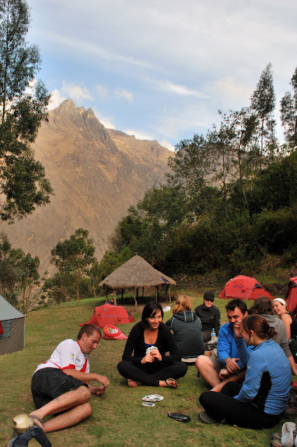At the end of the first day of trekking we arrived at our camp site, where the porters had kindly already set up our tents, and had snacks ready. We played cards and socialized with our group, before heading to bed at 8:00pm (!). To be fair, wake-up call for the next day was at 5:00am. We started each day our super early (in the dark) so that we had prime weather for hiking, and the trail mostly to ourselves. This also meant we finished hiking in the early/late afternoon everyday and had a good number of hours to "chill out" each evening.